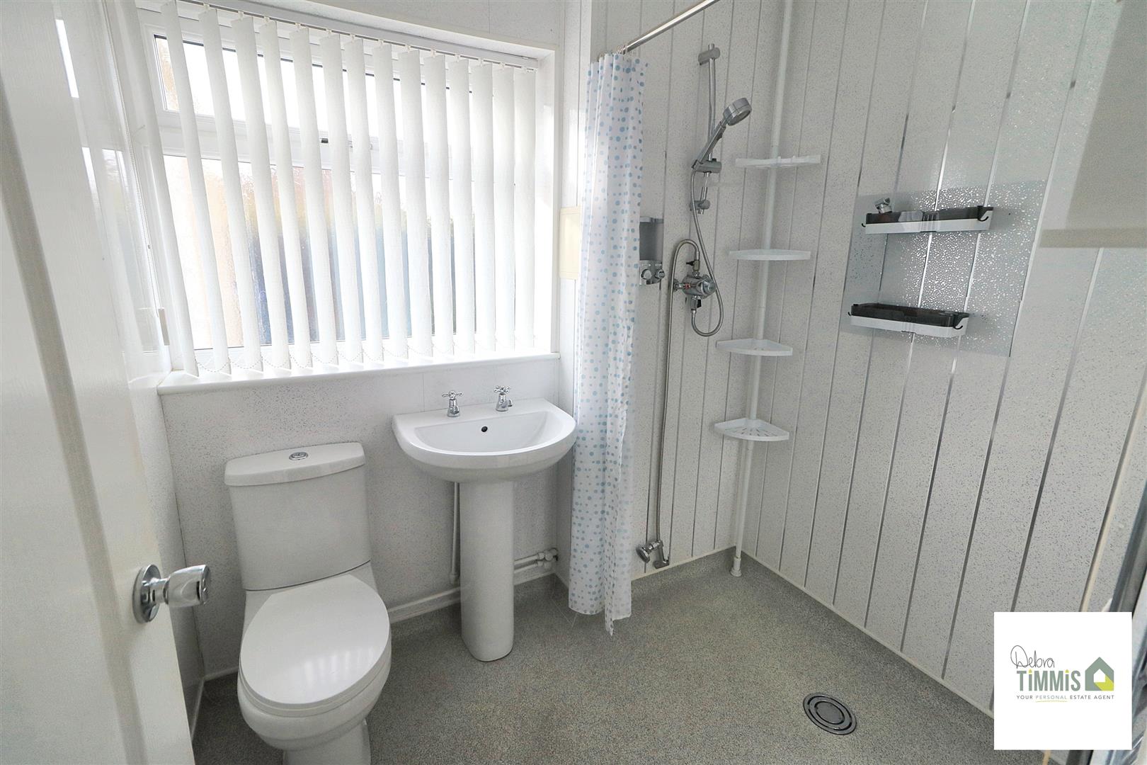Walk-in shower with mains shower, pedestal wash hand basin and low level WC. Radiator. Double glazed window.