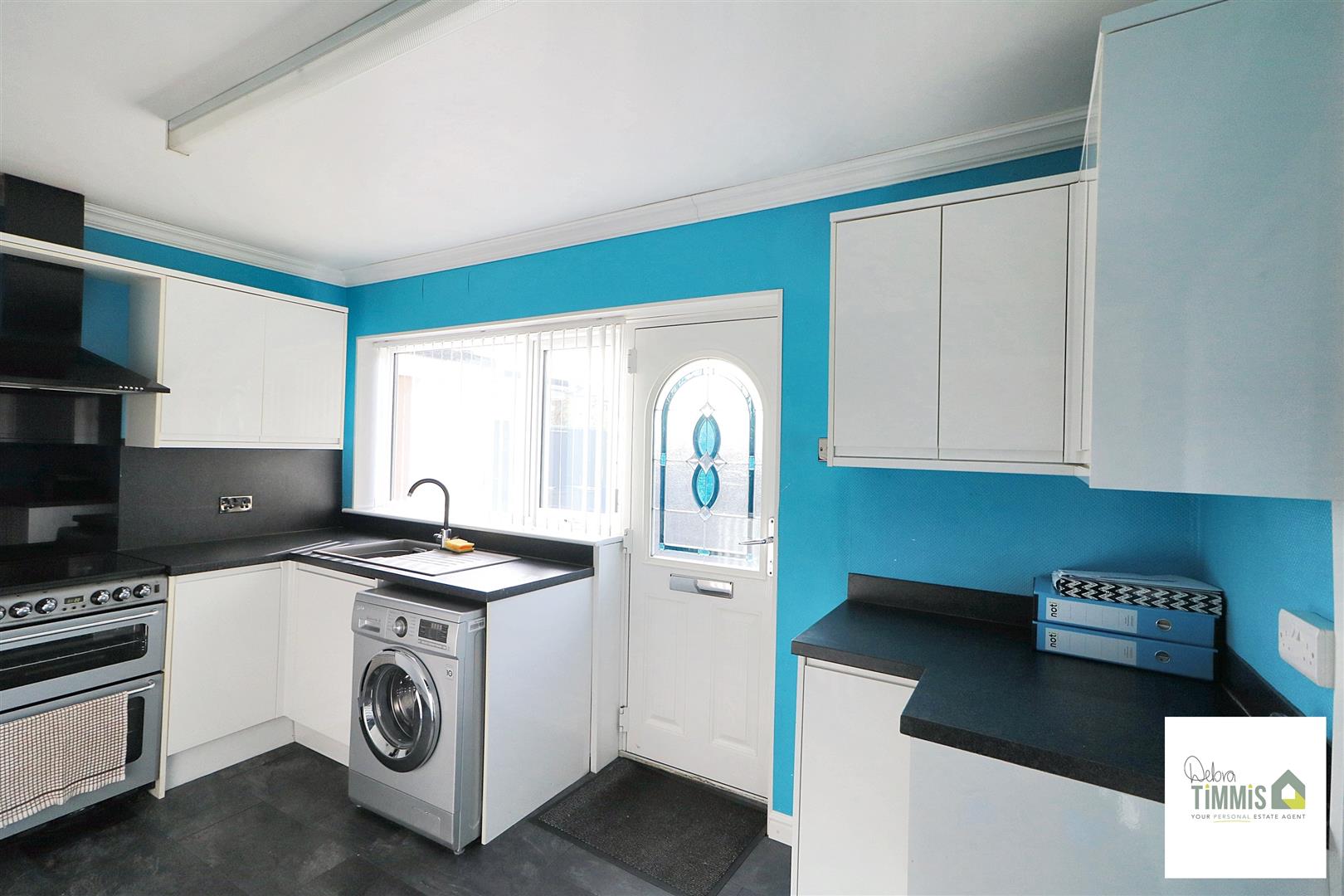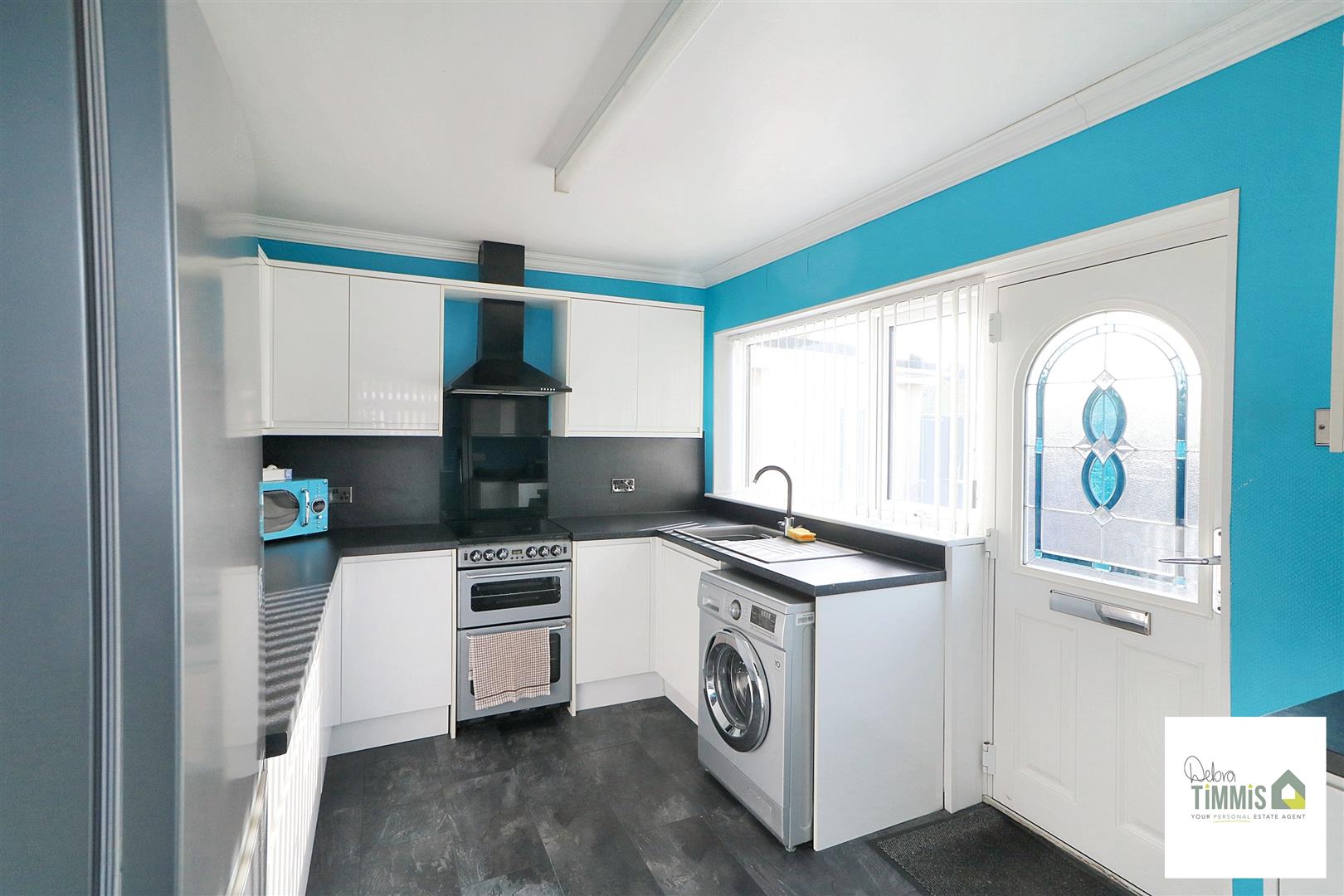 Fitted kitchen with a range of wall mounted units, worktops incorporating drawers and cupboards below. Sink with single drainer, mixer tap. Space for appliances. Two double glazed windows and composite door to the side aspect.