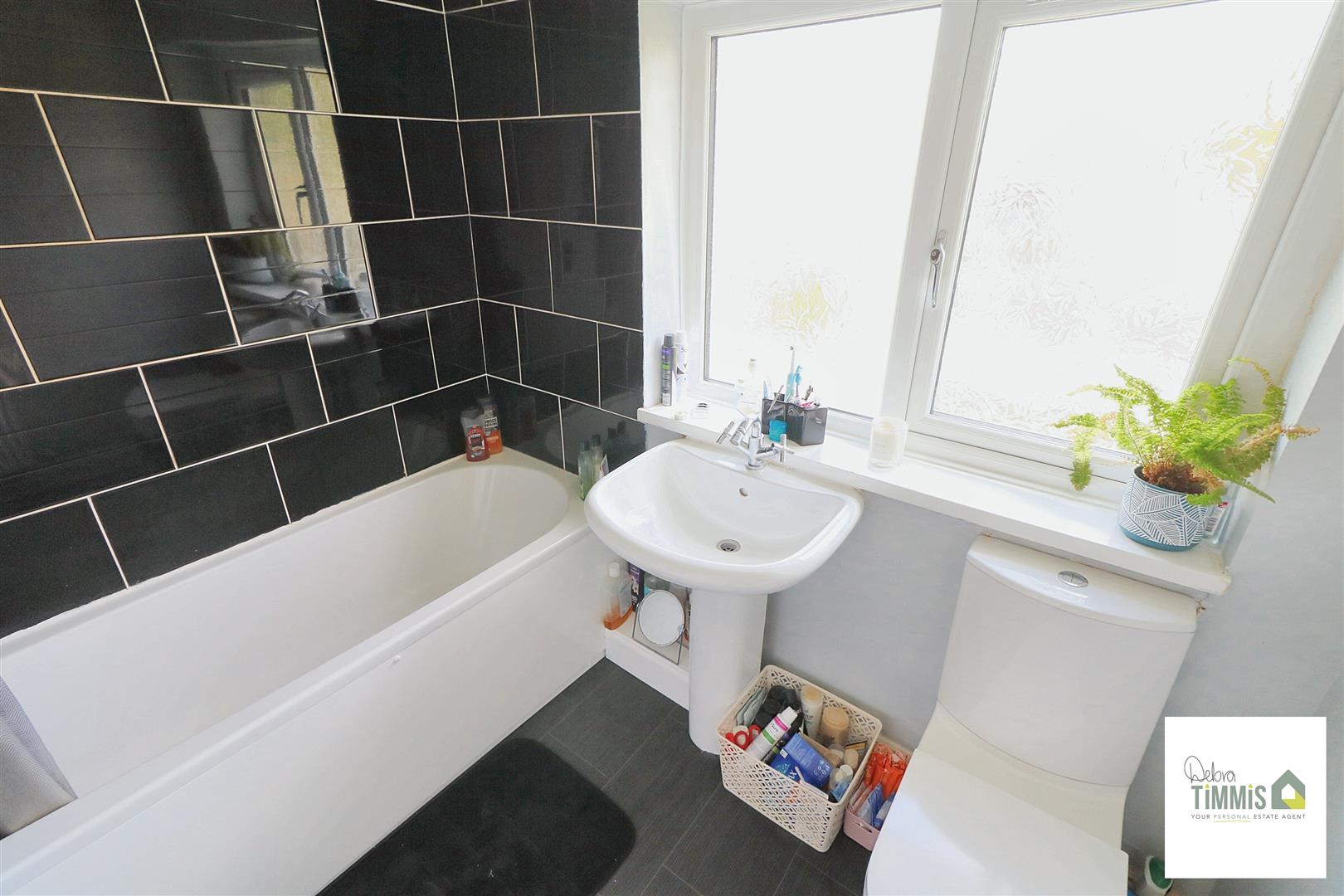White suite comprises, panelled bath with shower attachment, pedestal wash hand basin and low level WC. Radiator. Double glazed window.