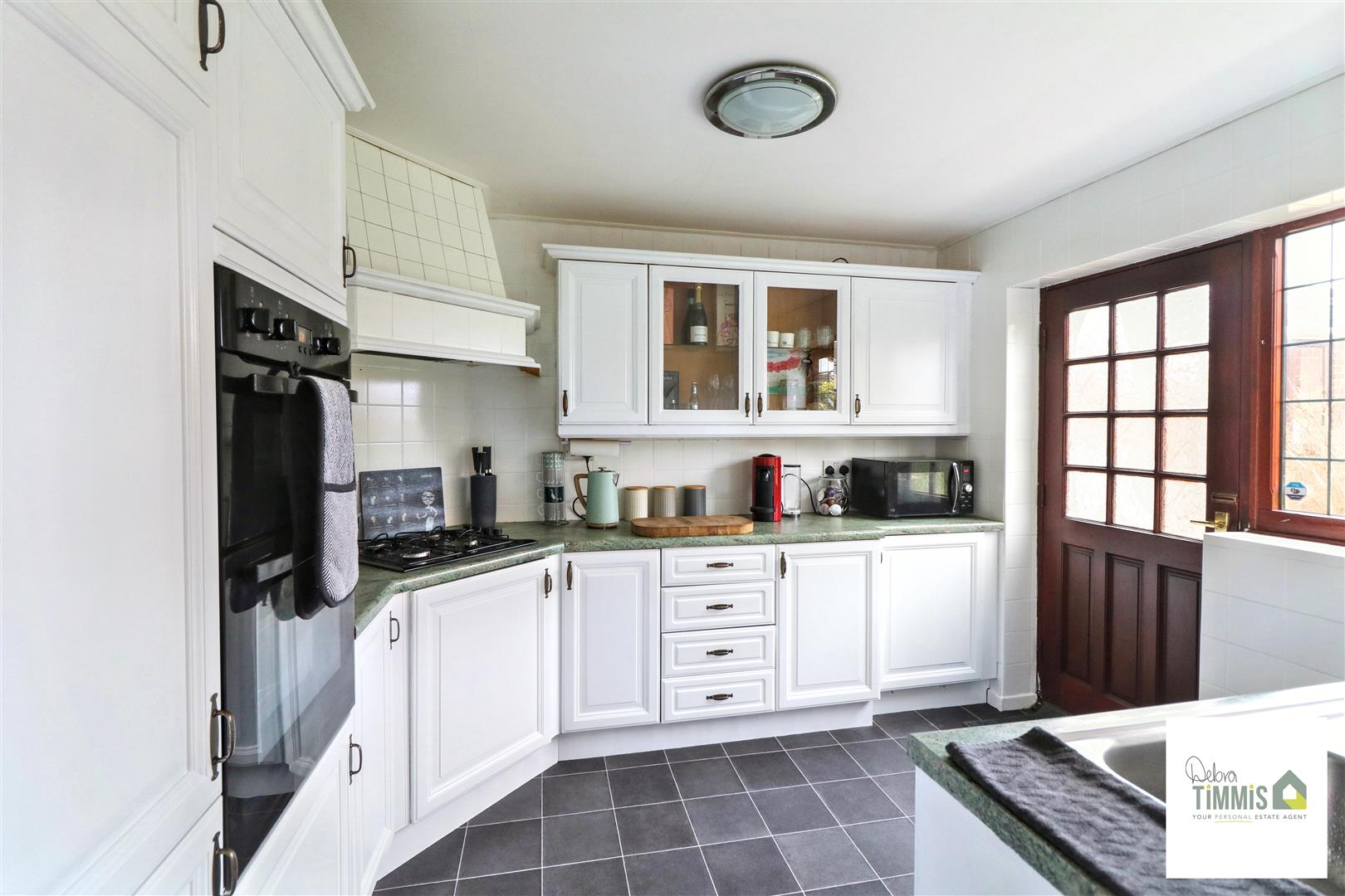 Fitted kitchen with a range of wall mounted units, worktops incorporating drawers and cupboards below. Four ring gas hob with extractor canopy over. Built-in oven. One and a half bowl stainless steel sink and drainer with mixer tap. Tiled walls. Double glazed window. Rear door access.