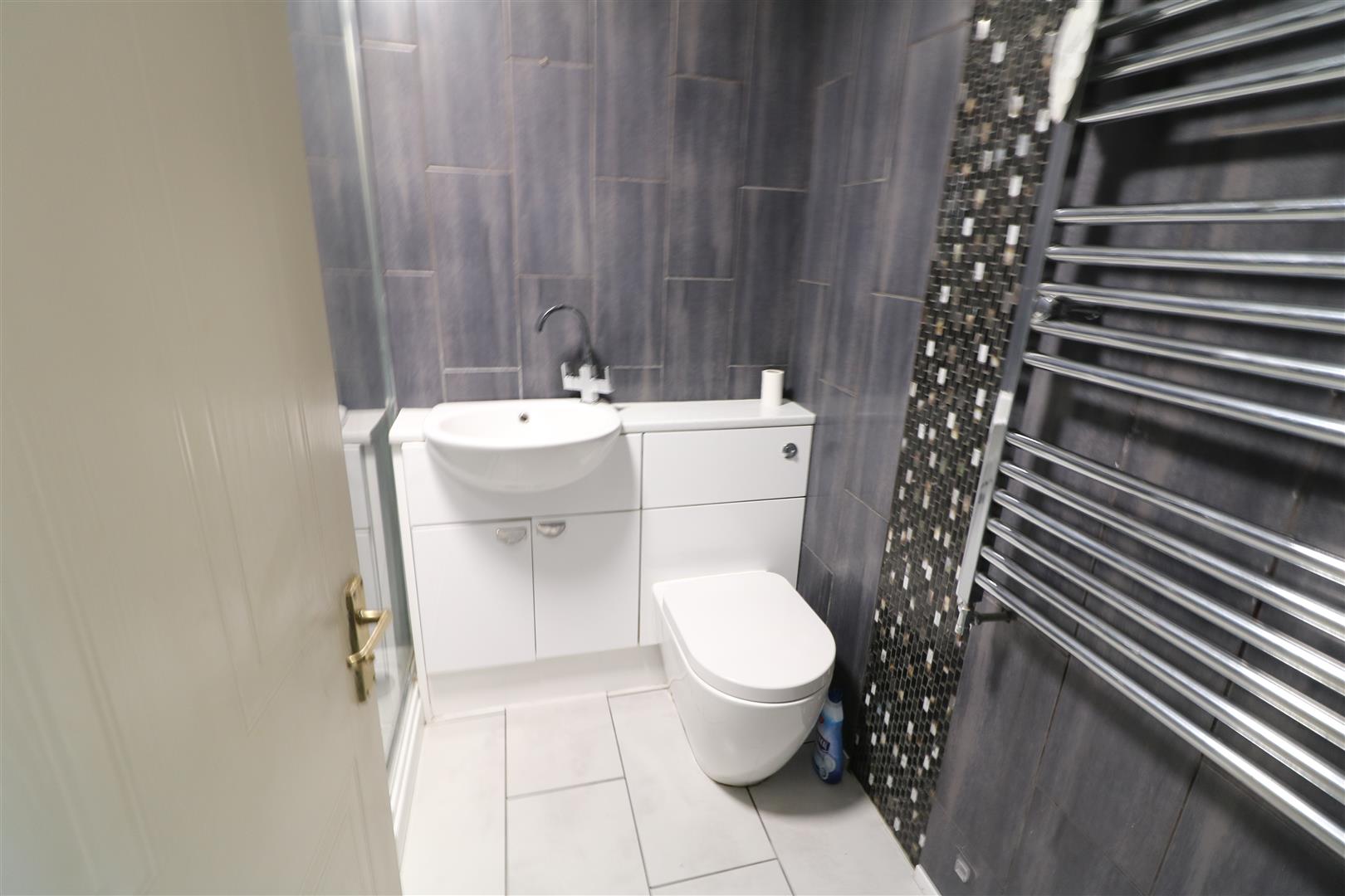 Suite comprises, shower cubicle housing mains shower, combination vanity wash hand basin and WC. Heated towel rail. Tiled walls.