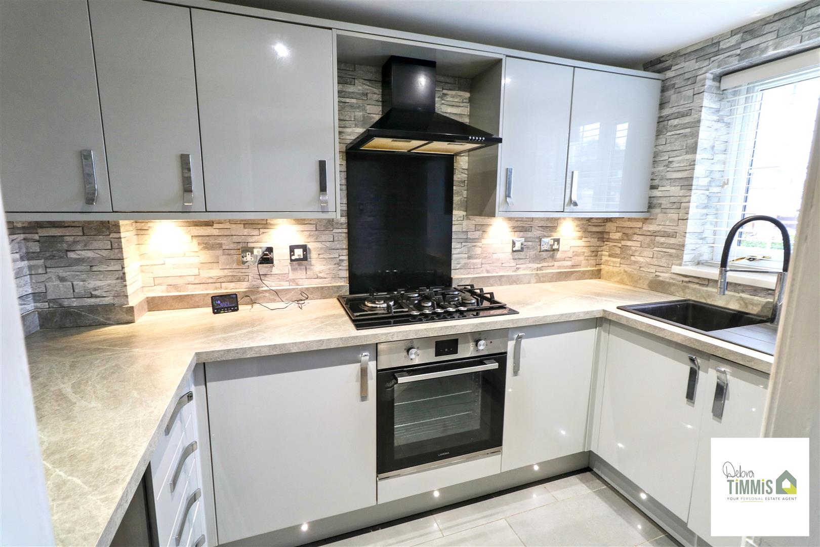 Fitted kitchen with a range of wall mounted units, worktops incorporating drawers and cupboard below. Inset sink with single drainer. Integrated washing machine. Four ring gas hob with extractor fan above and built-in oven. Cupboard housing gas central heating boiler. Inset ceiling spot lights. Double glazed window to the front aspect.