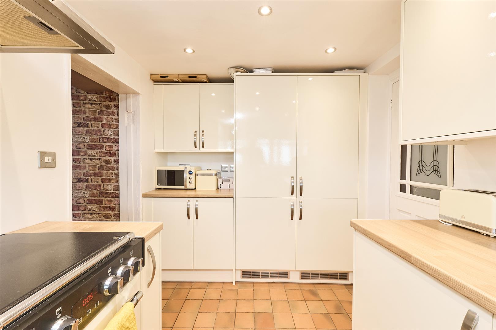 Fitted kitchen with a range of wall mounted units, worktops incorporating drawers and cupboards below. Inset sink with single drainer. Integral space for fridge and freezer and dishwasher. Space cooker. Integral washing machine. One and a half bowl inset sink. Double glazed window.