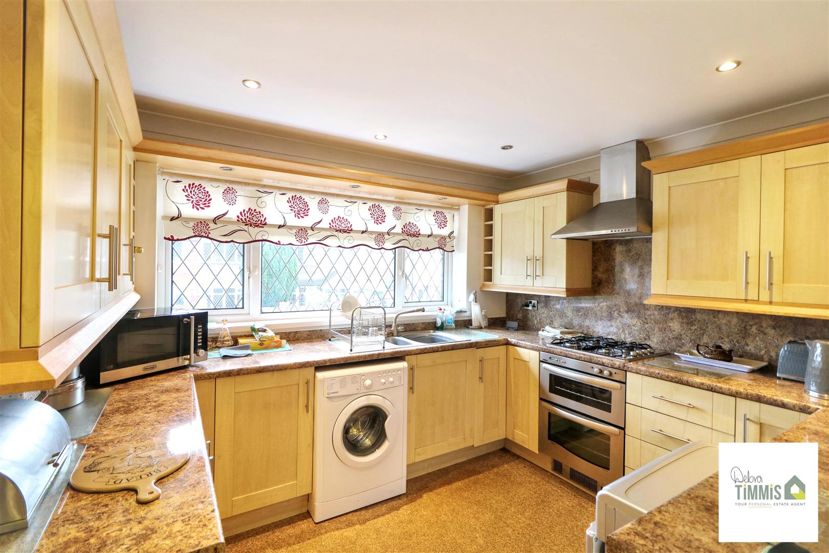 Fitted kitchen with a range of wall mounted units, worktops incorporating drawers and cupboards below. One and a half bowl sink with single drainer and mixer tap. Four ring gas hob and built-in oven. Space for washing machine. Inset ceiling spot lights. Double glazed window.