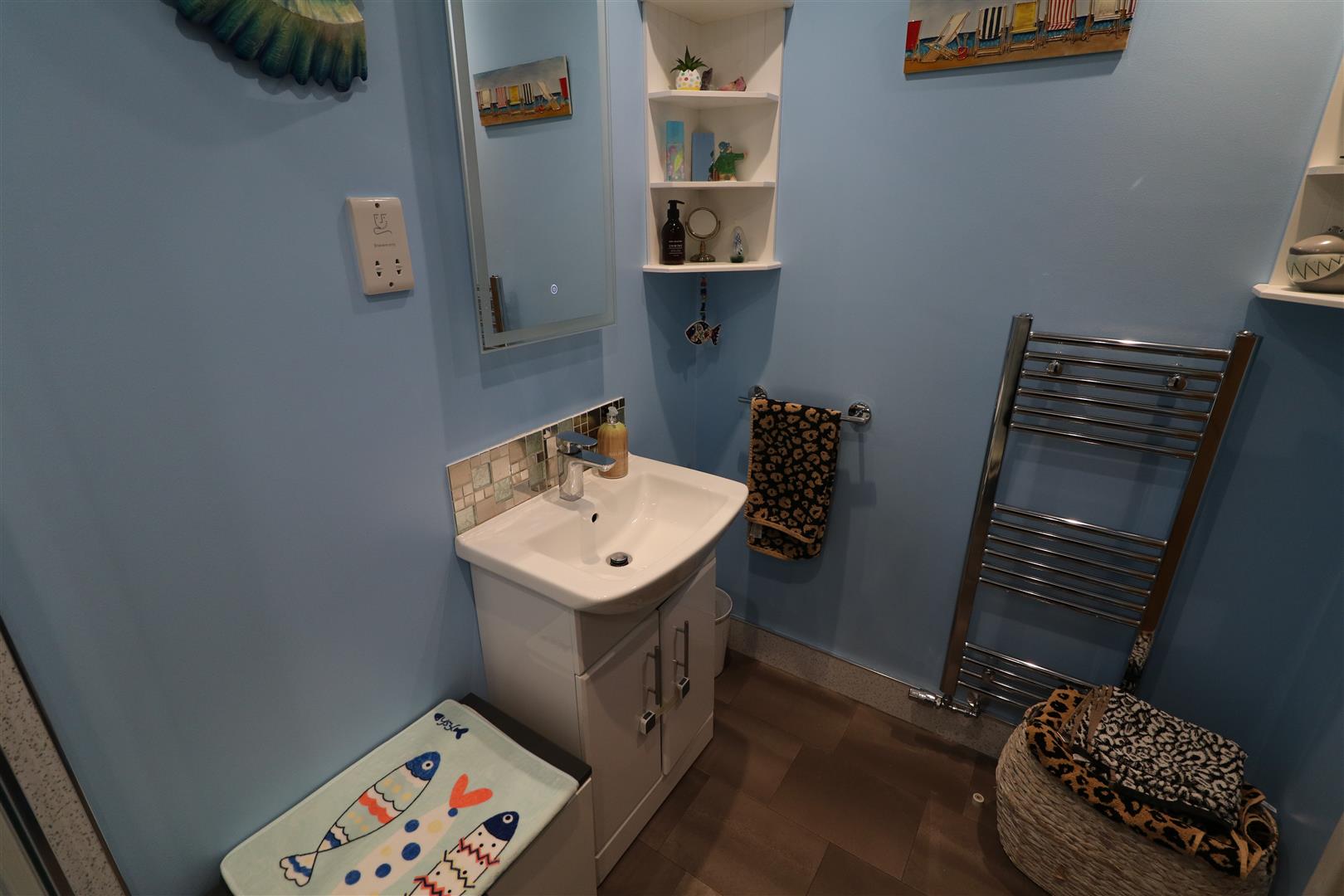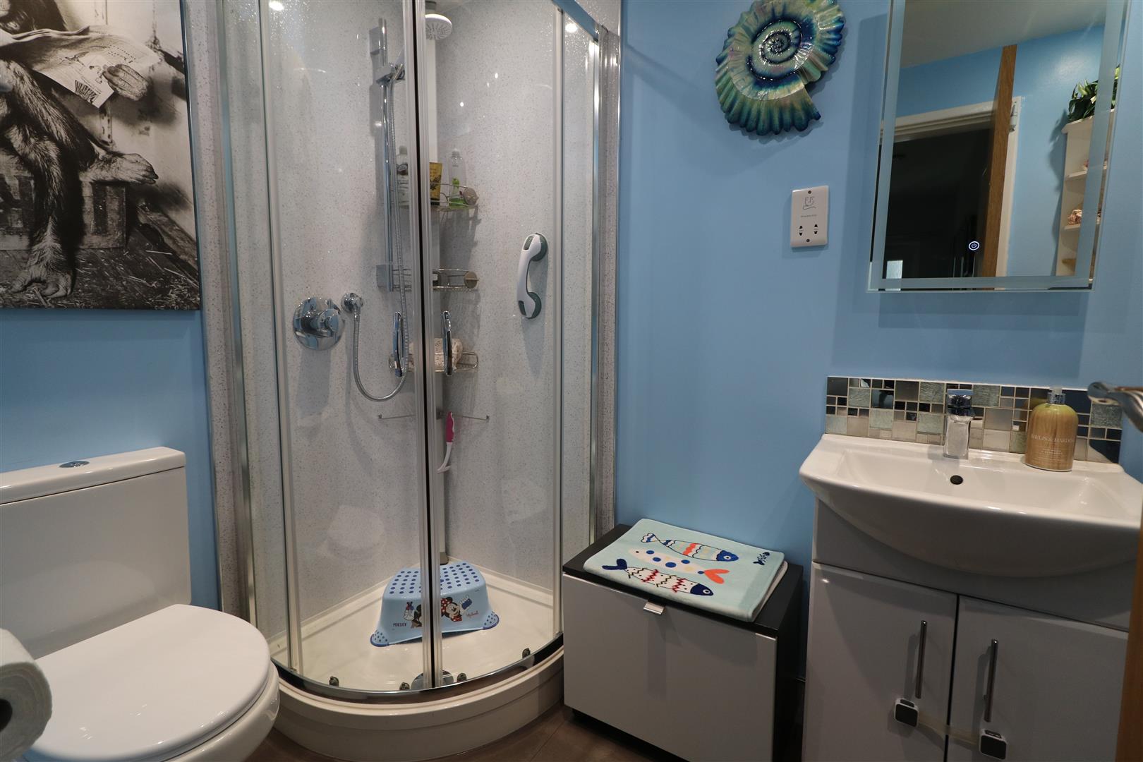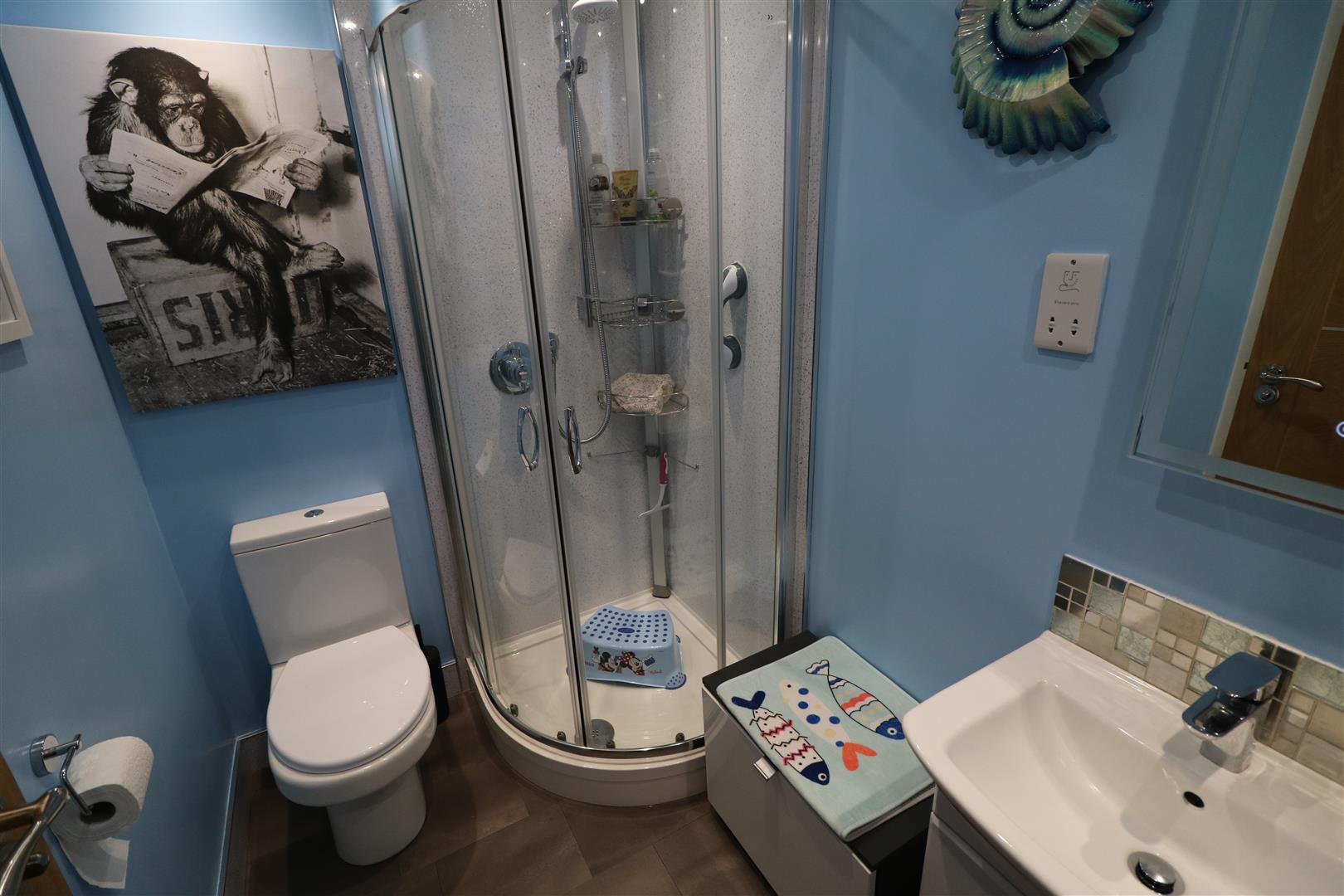 White suite comprises, shower cubicle housing shower, vanity wash hand basin and low level WC. Heated towel rail. Inset ceiling spot lights. Extractor fan.