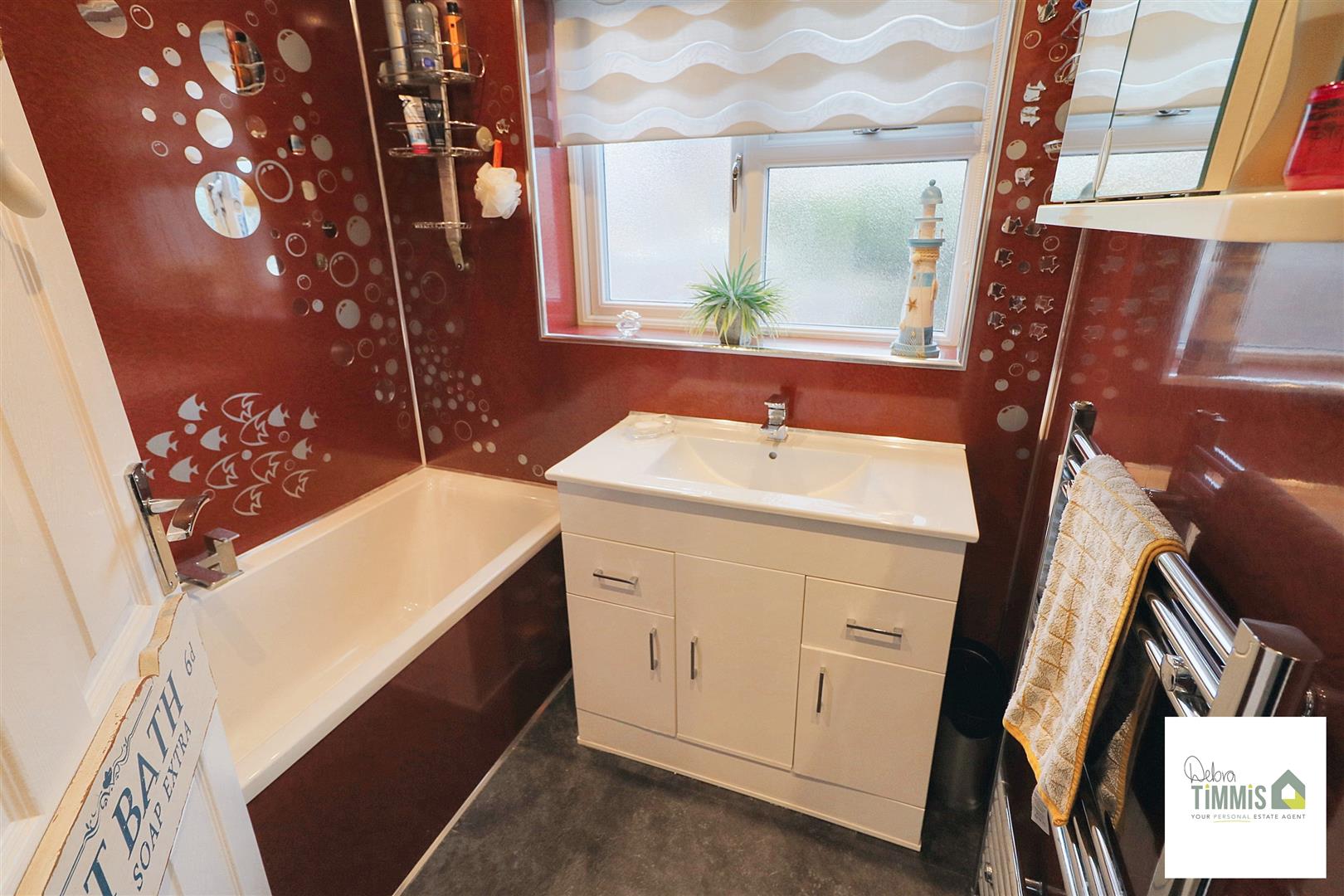 White suite comprises, panel bath with shower over and vanity wash hand basin. Heated towel rail. Inset ceiling spot lights. Double glazed window.