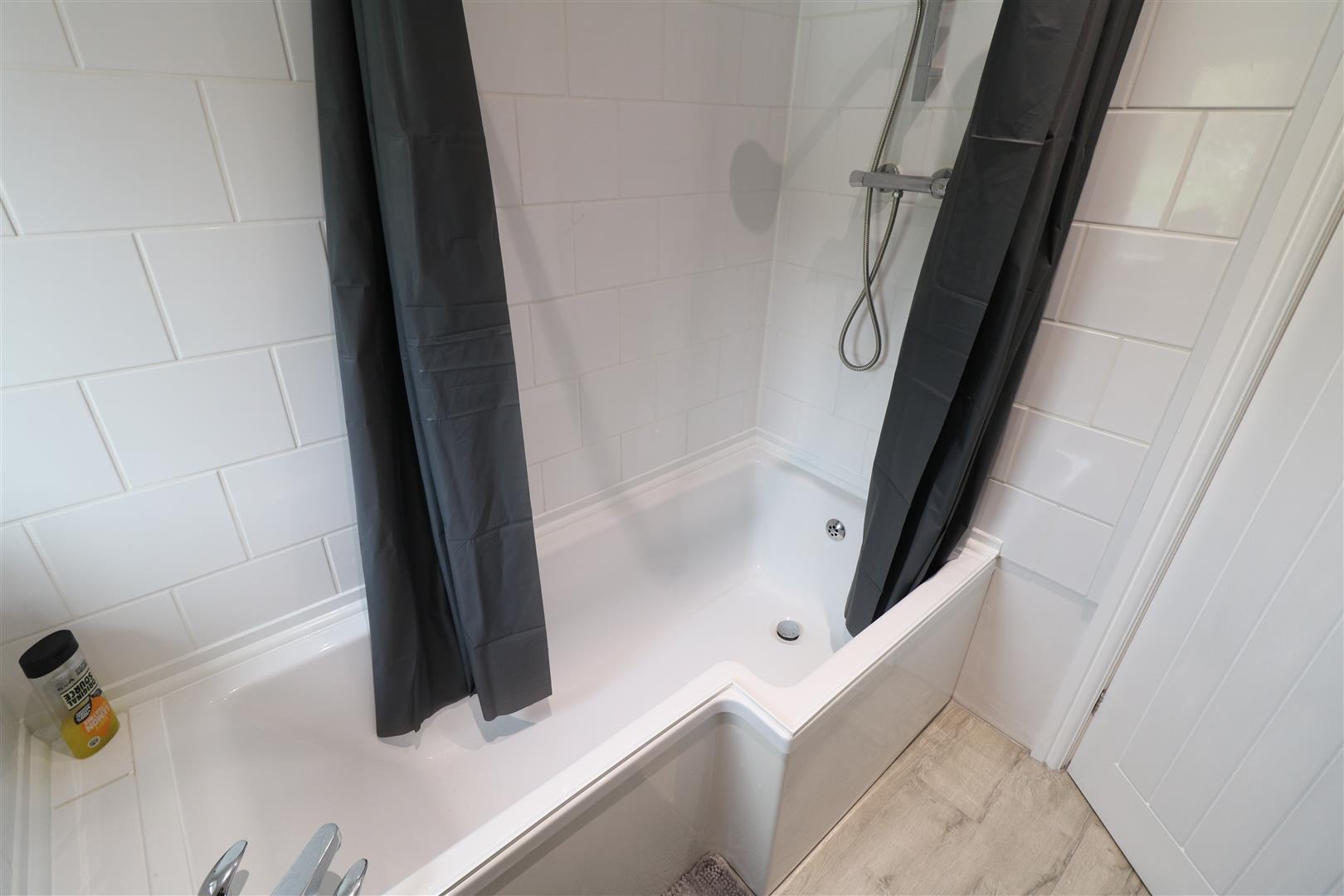 White suite comprises, bath with mains shower unit over, combination vanity wash hand basin and WC. Part tiled walls. Double glazed window. Radiator. Inset ceiling spot lights.