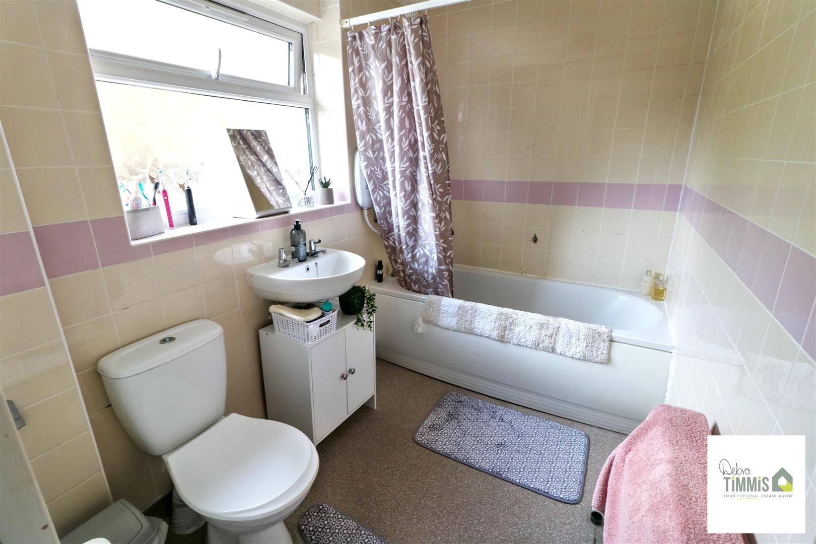 Suite comprises, panel bath with shower unit over, pedestal wash hand basin and low level WC. Tiled walls. Double glazed window to the rear aspect.