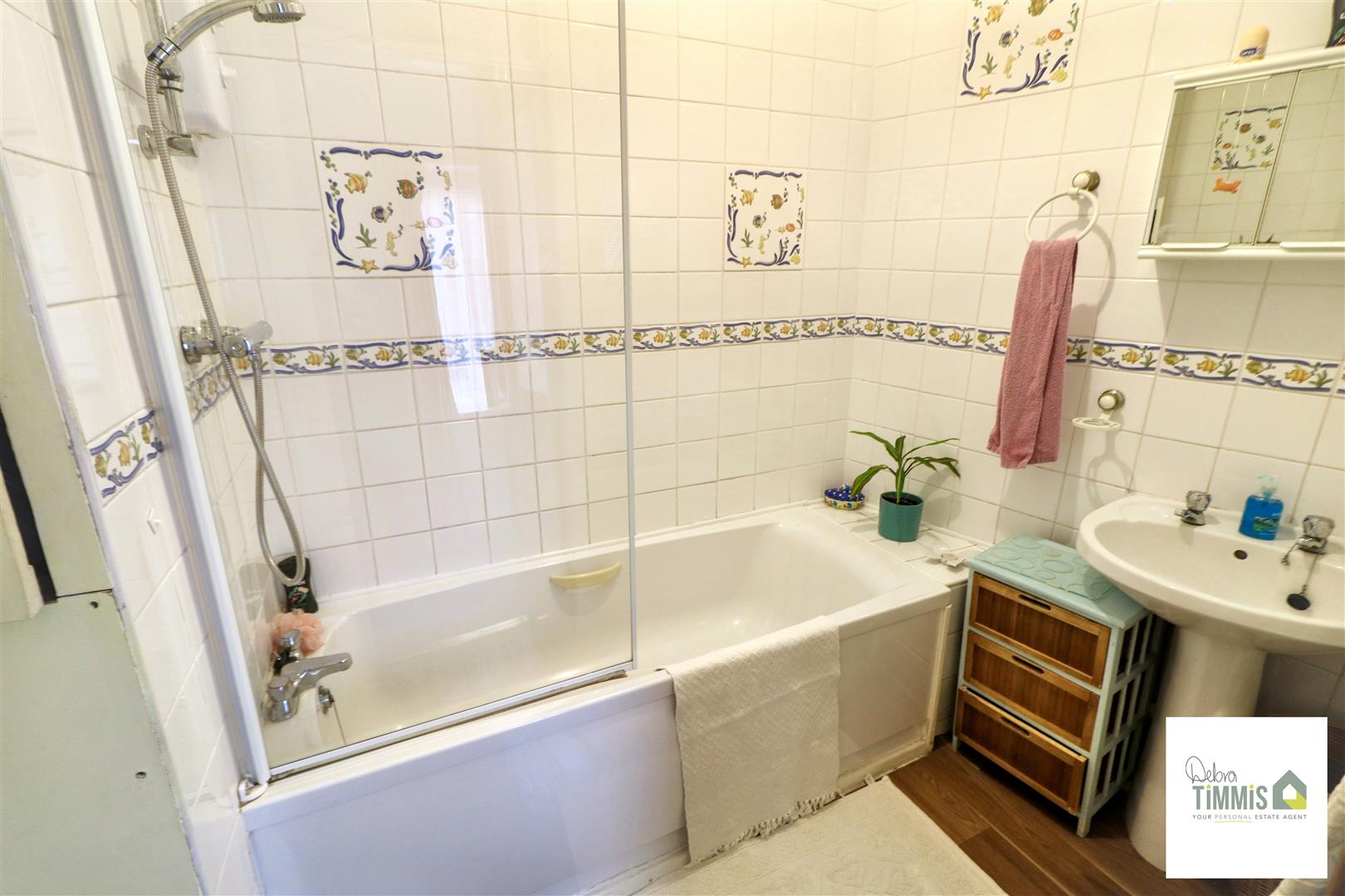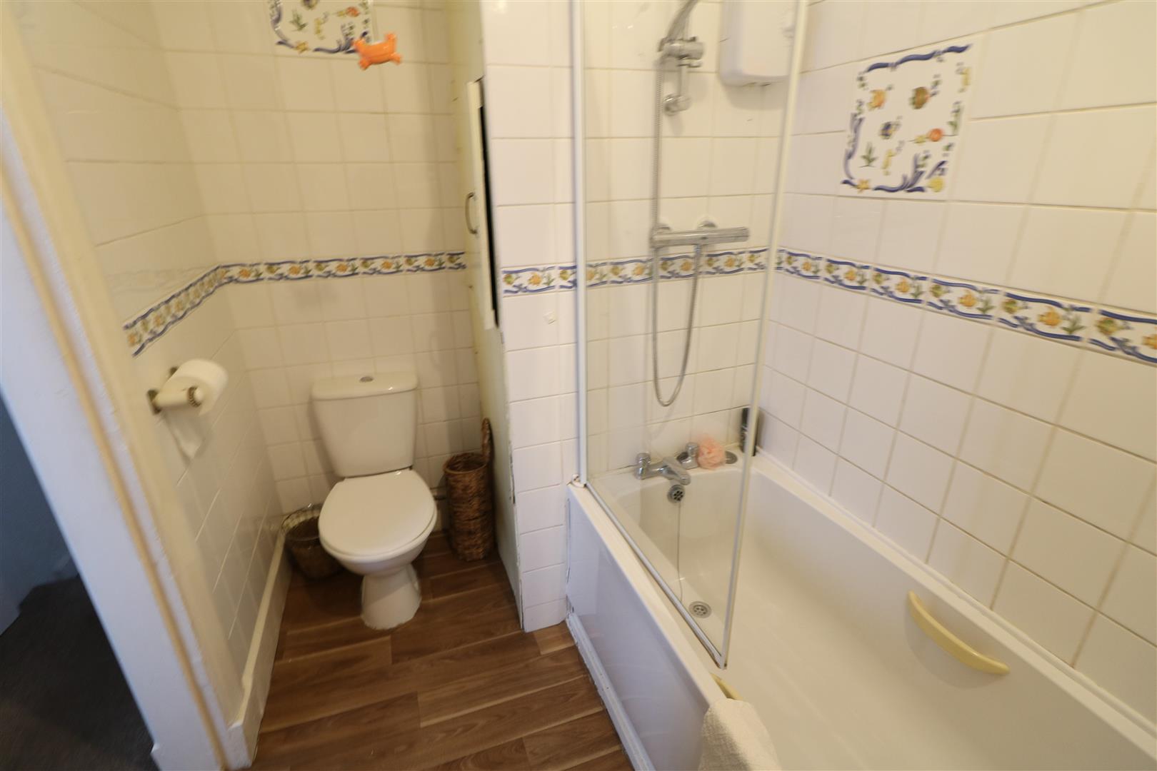 Suite comprises, panelled bath, mains shower, pedestal wash hand basin and low level WC. Tiled walls. Heated towel rail. Useful storage.