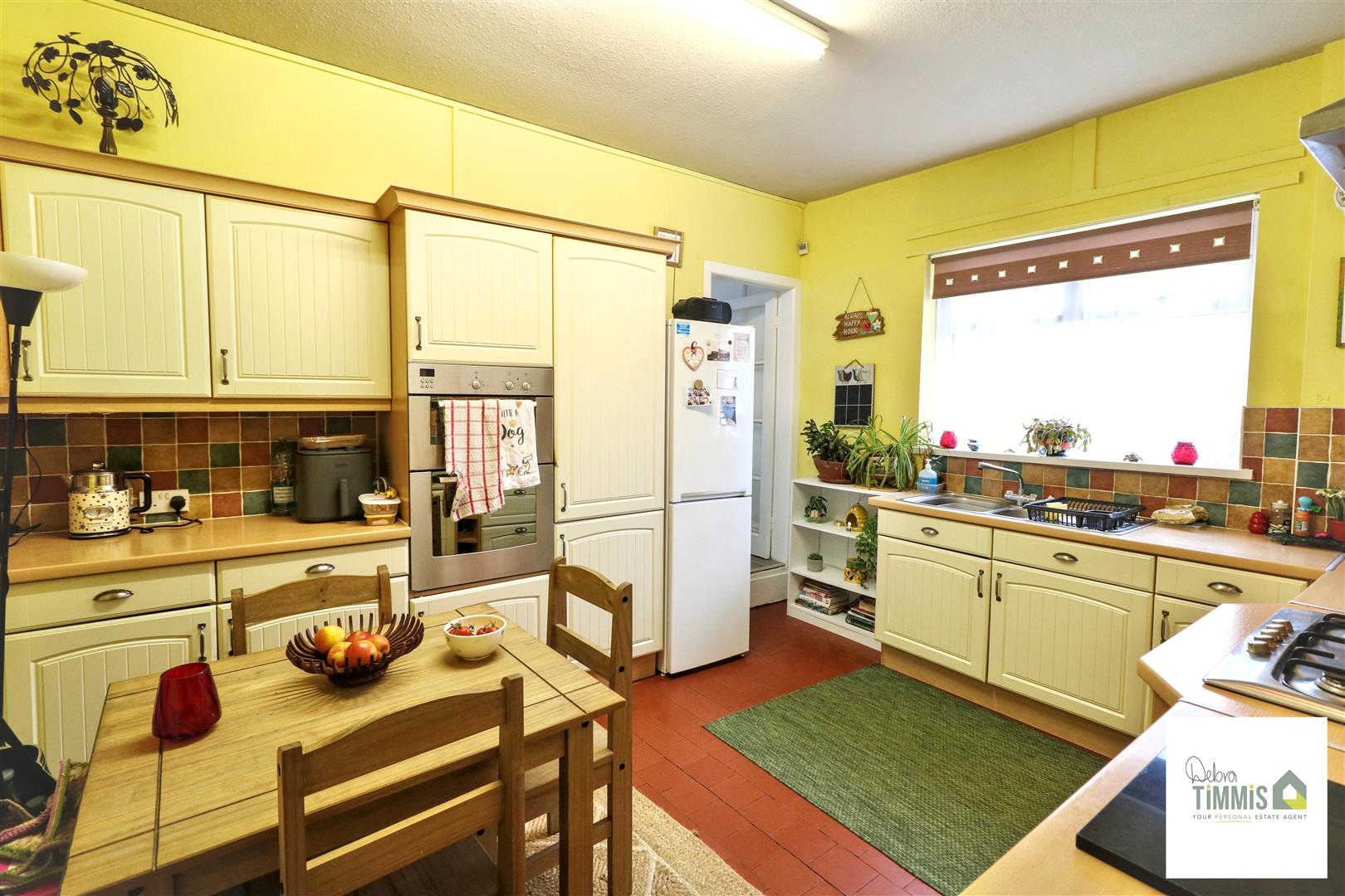 Fitted kitchen with a range of wall mounted units, worktops incorporating drawers and cupboards below. Five ring gas hob with extractor hood. Built-in oven. One and a half bowl sink with single drainer. Part tiled splash backs. Quarry tiled floor. Space for breakfast table. Double glazed window. Radiator.