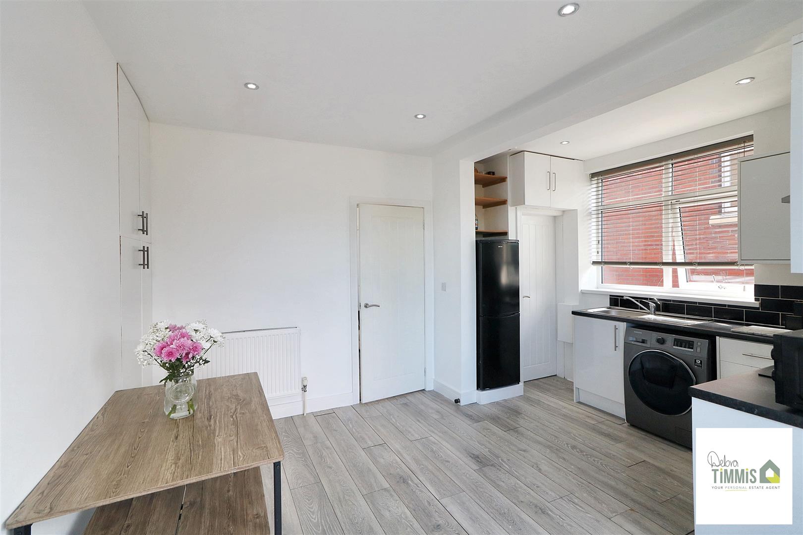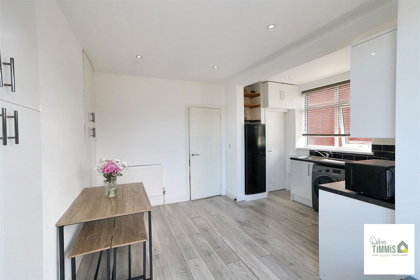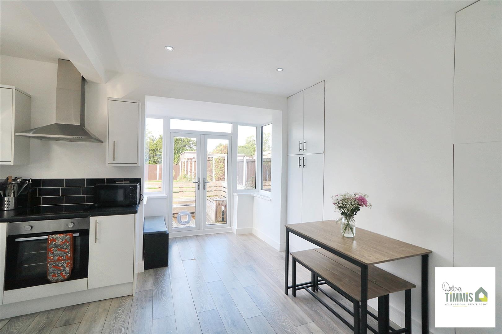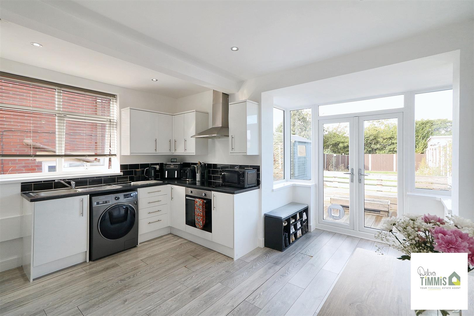 Well presented fitted kitchen with a range of wall mounted units, worktops incorporating drawers and cupboard below. Four ring electric hob, Extractor hood and built-in oven. Stainless steel inset sink with single drainer and mixer tap. Plumbing for automatic washing machine. Inset ceiling spot lights. Double glazed window. Double glazed French doors with access into the rear garden. Useful storage cupboard. Space for dining table. Radiator. Space for dining table. Built-in cupboards.