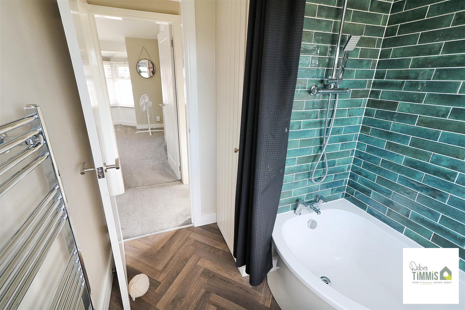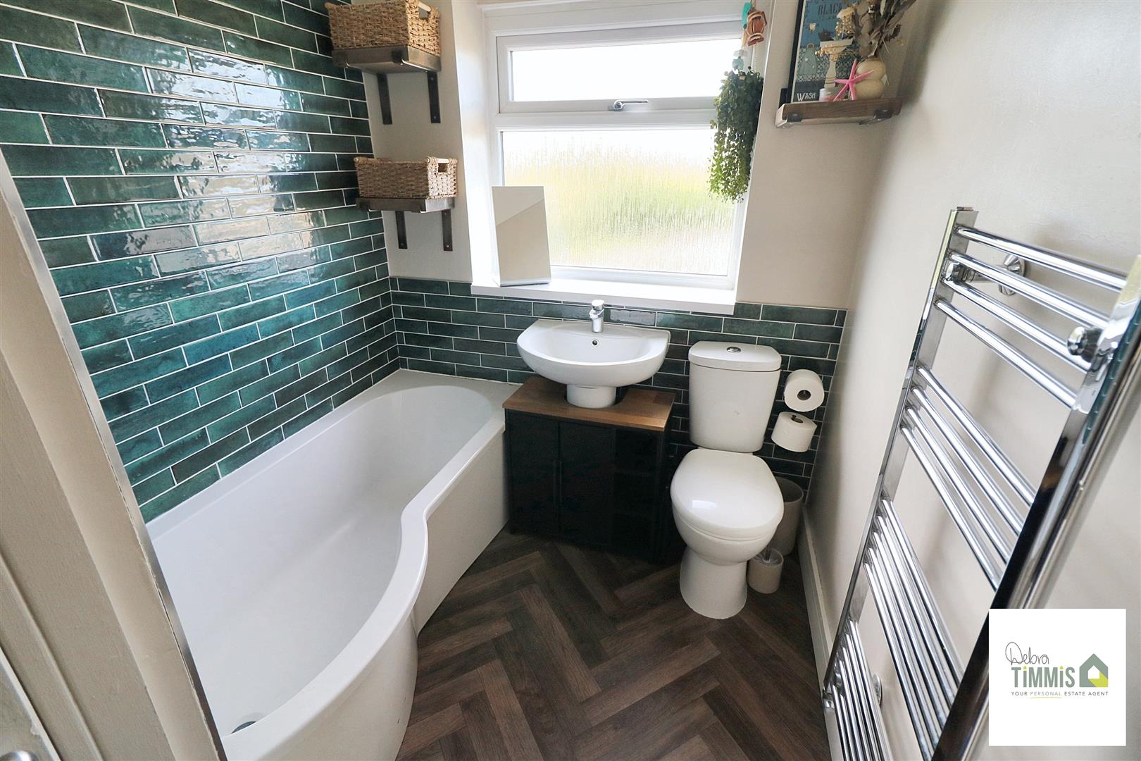 Modern suite comprises, panel bath with mains shower over, wash hand basin and WC. Heated towel rail. Cupboard housing gas central heating boiler. Double glazed window.
