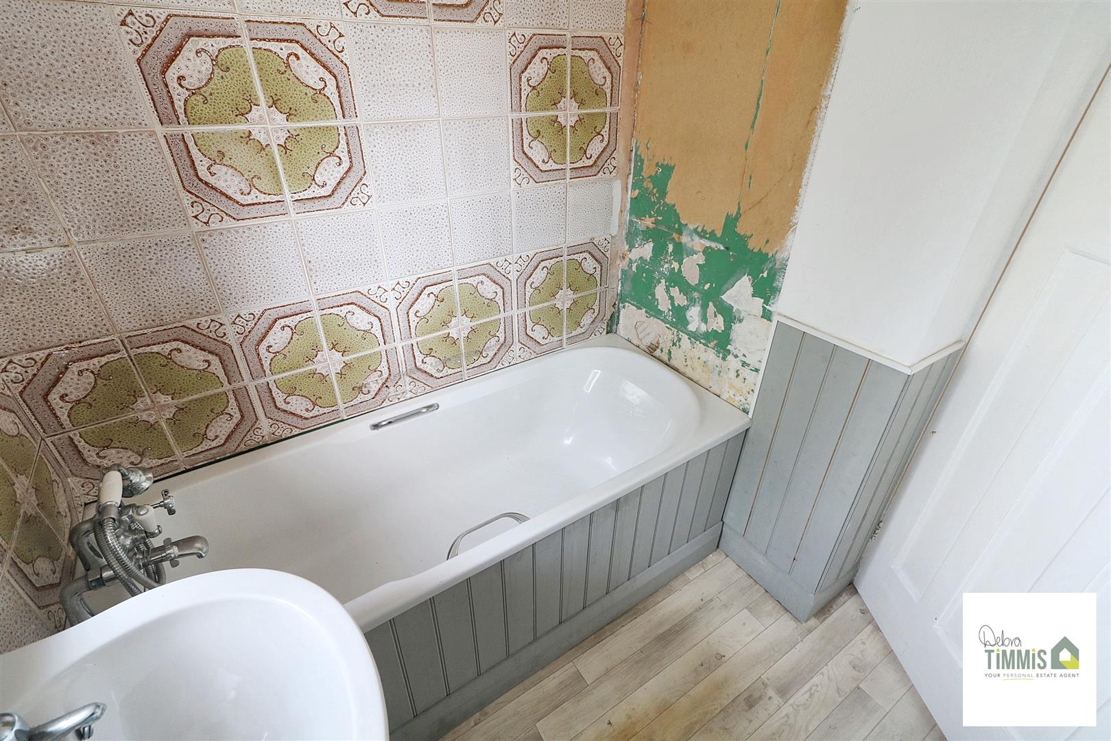 Suite comprises, panelled bath and pedestal wash. Single glazed window.
