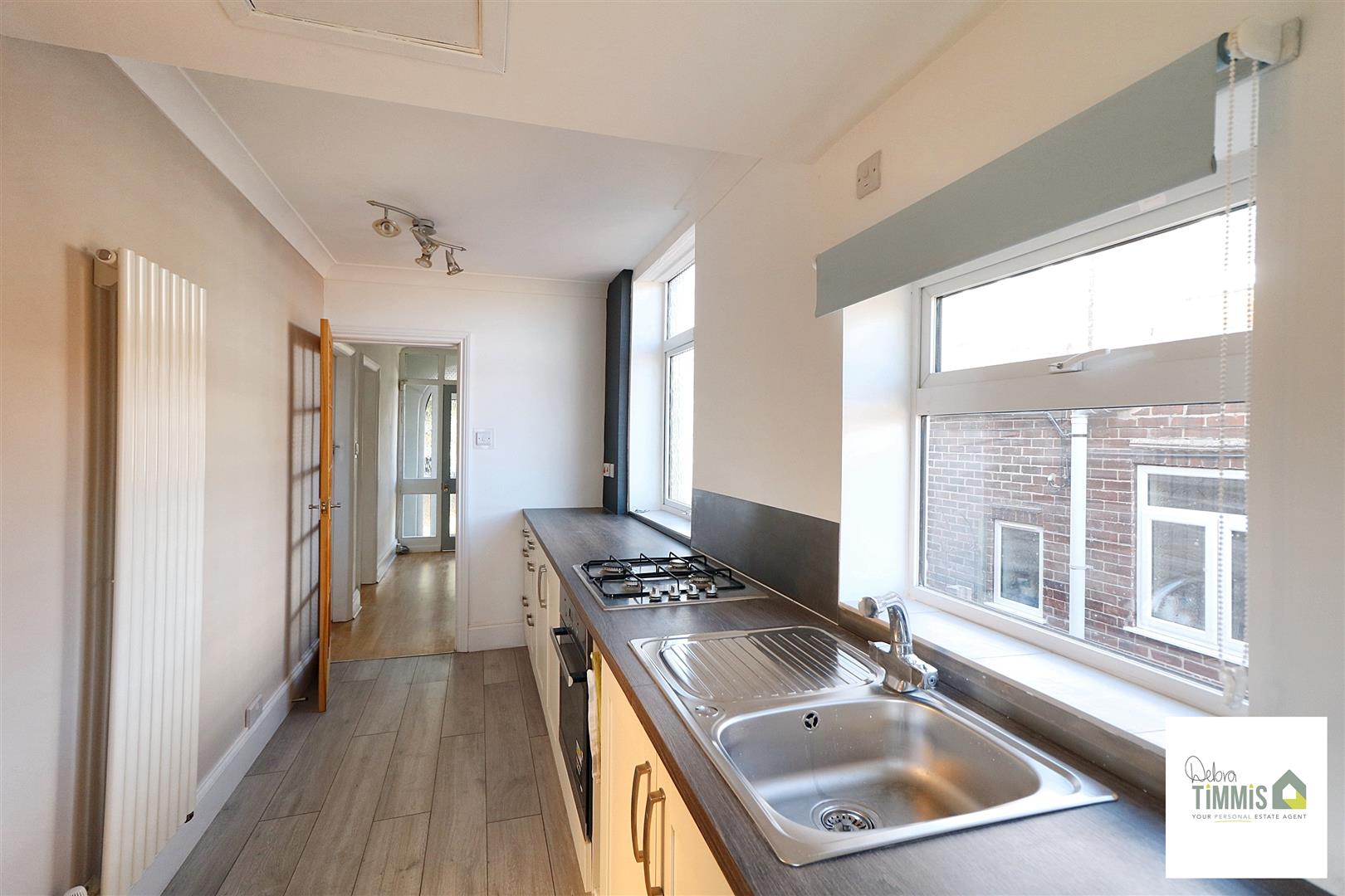 Well presented fitted kitchen with worktop incorporating drawers and cupboards below. Four ring gas hob and built-in oven. Stainless steel sink with single drainer and mixer tap. Heated panel radiator. Space for appliances. Plumbing for automatic washing machine. Laminate flooring. Three double glazed windows. Side door with access into the rear garden.
