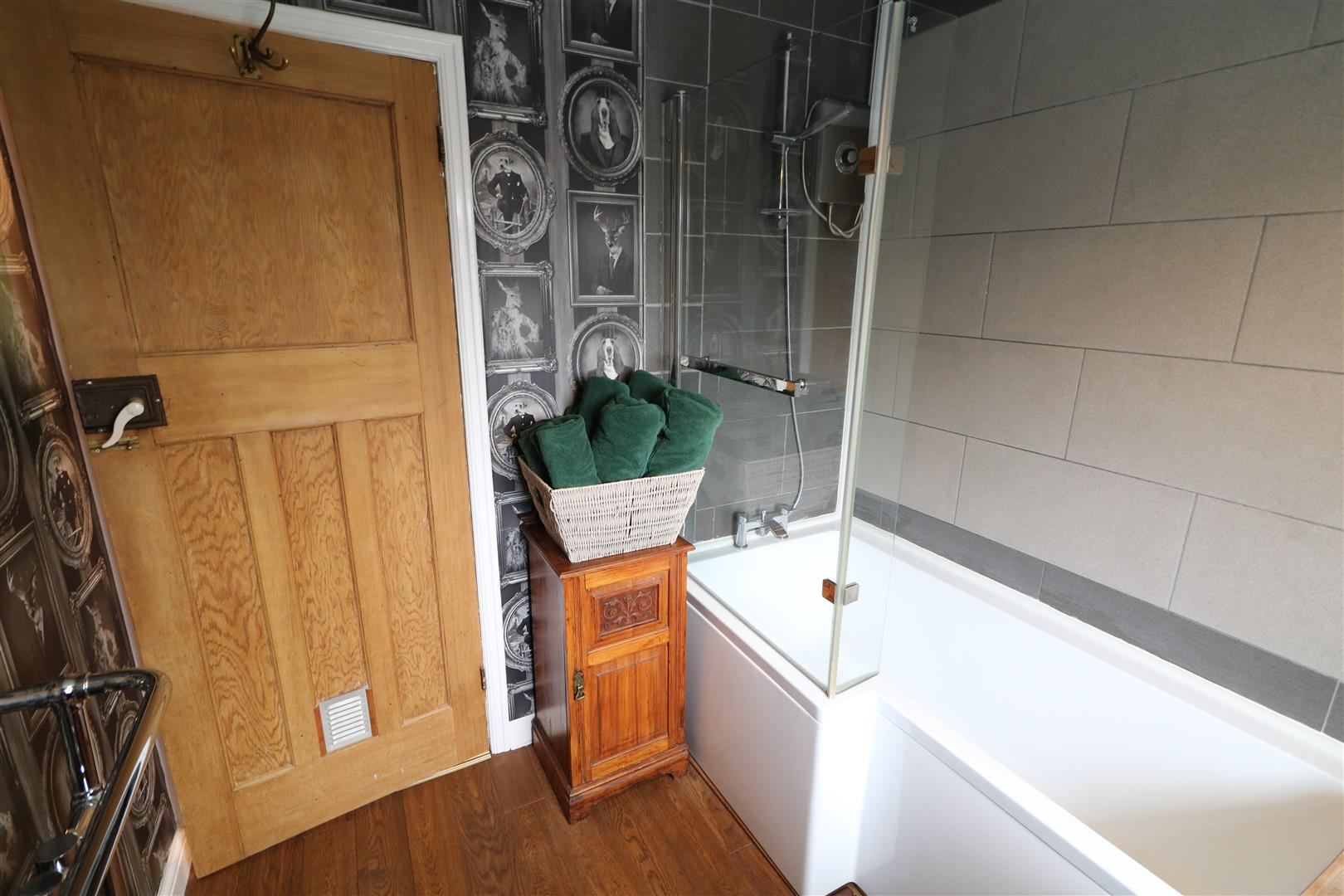 Stylish white suite comprises, panel bath with shower mixer plus electric shower over, pedestal wash hand basin and low level WC. Double glazed window.