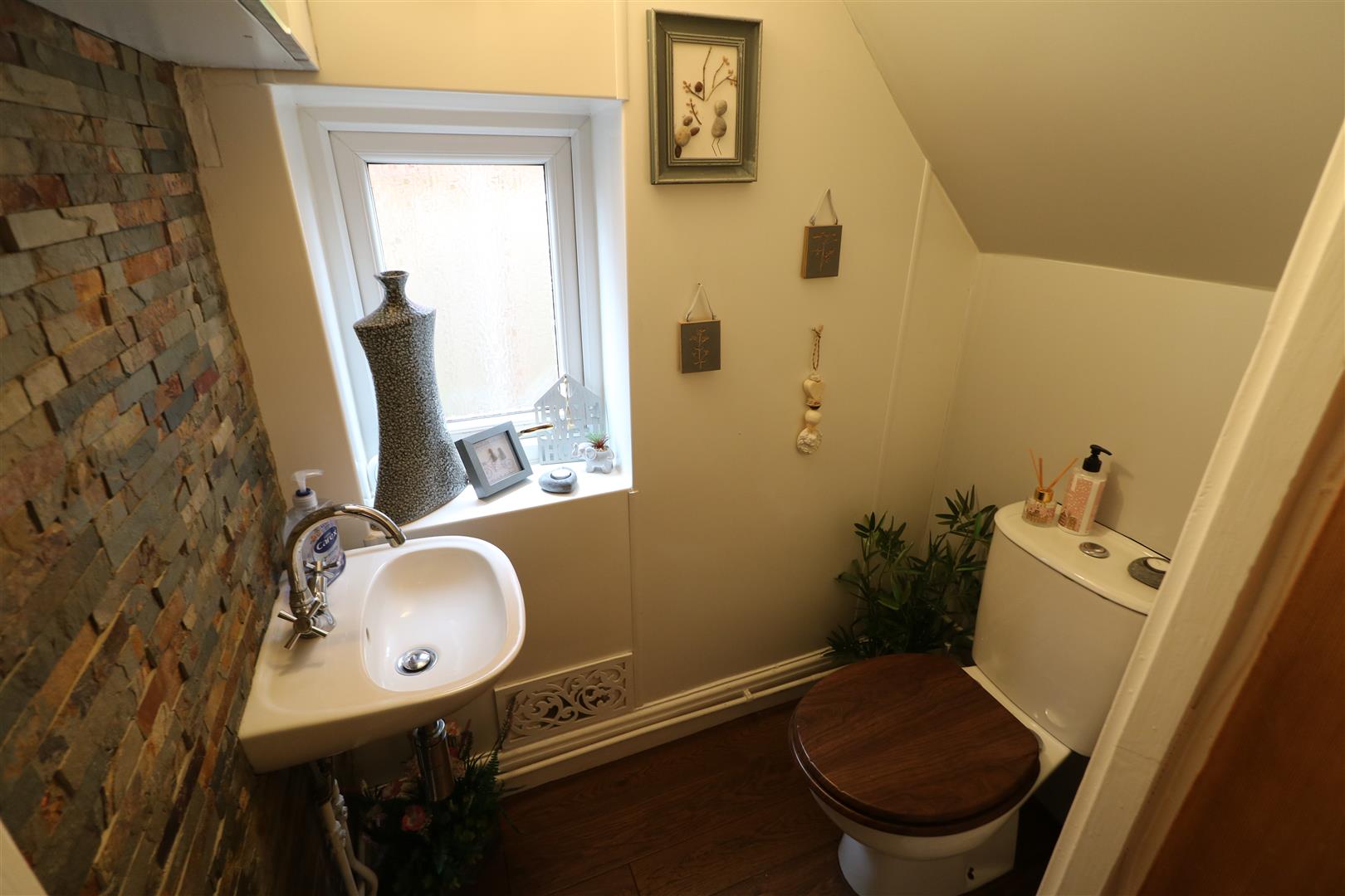 Double glazed window to the side aspect. Low level WC and wash hand basin.