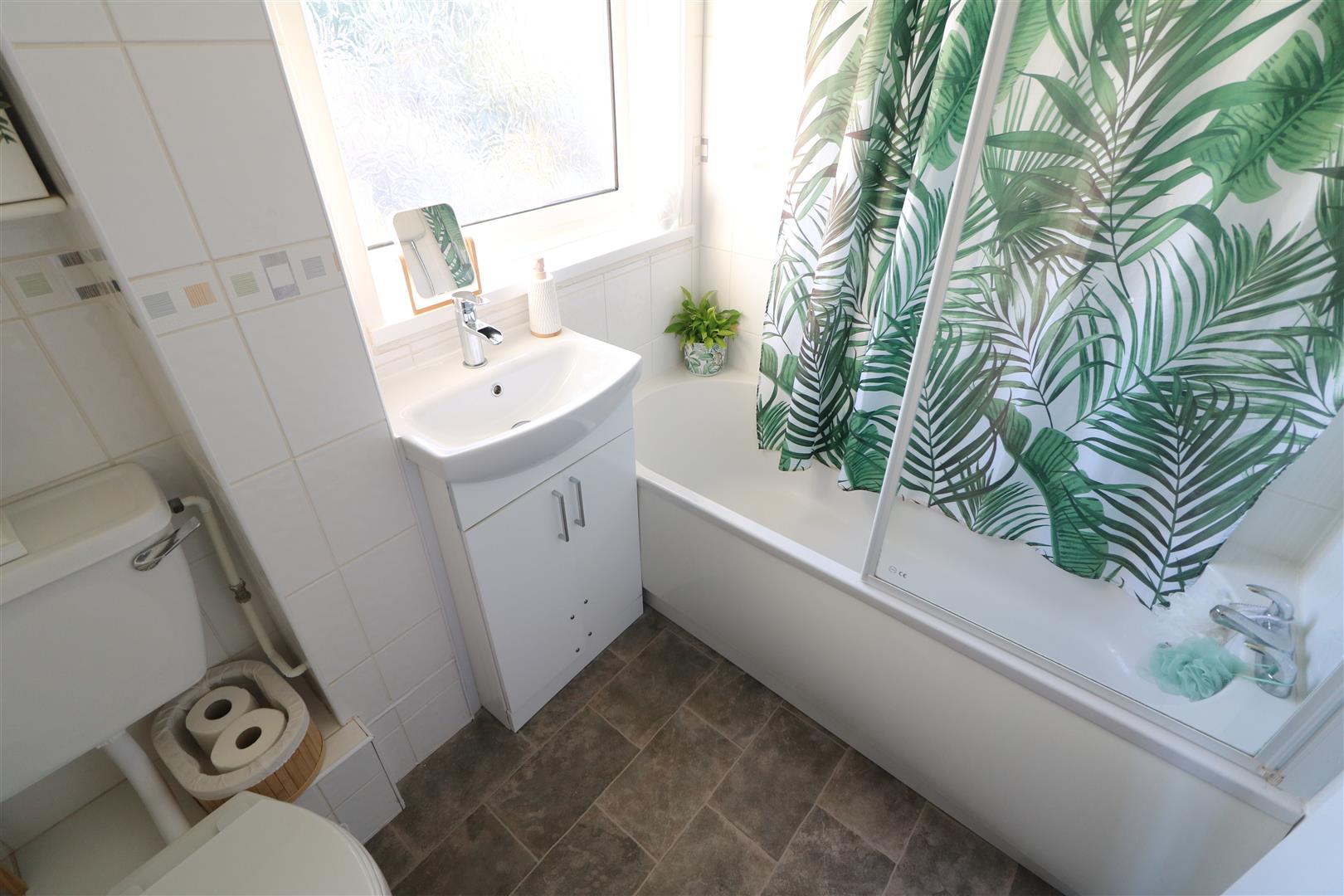 White suite comprises, panelled bath with Triton shower over and fitted shower screen. Vanity wash hand basin and low level WC. Tiled walls. Heated towel rail. Double glazed window.