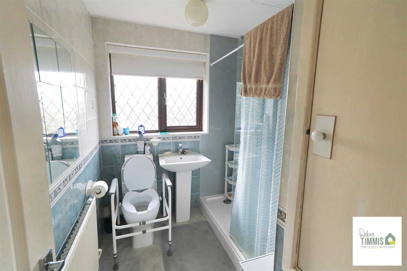 Suite comprises, shower tray with mains shower unit over, pedestal wash hand basin and low level WC. Mostly tiled walls. Cupboard housing gas central heating boiler. Double glazed window to the front aspect. Radiator.