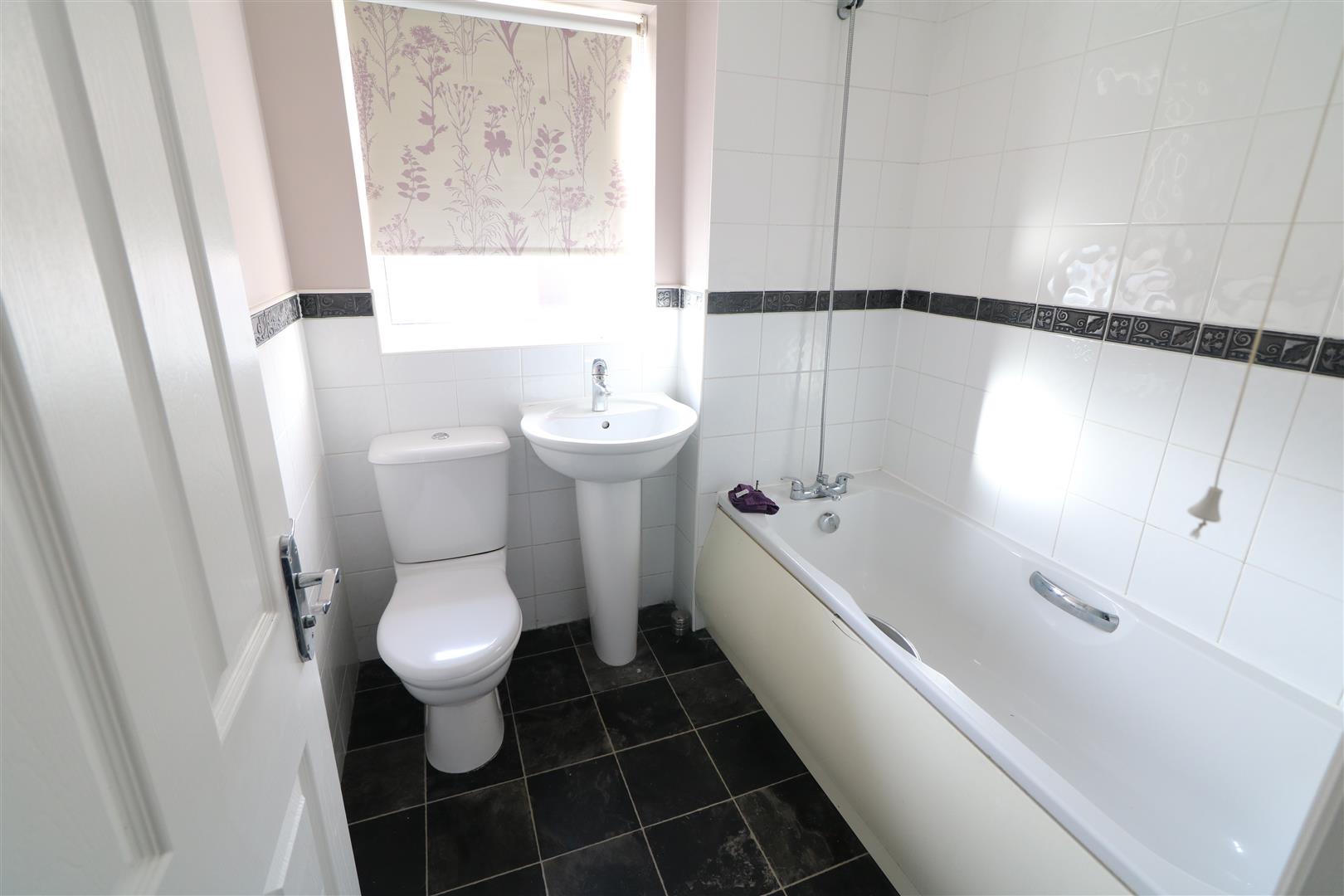 White suite comprises, panel bath with shower attachment, pedestal wash hand basin and low level WC. Part tiled walls. Double glazed window. Radiator.